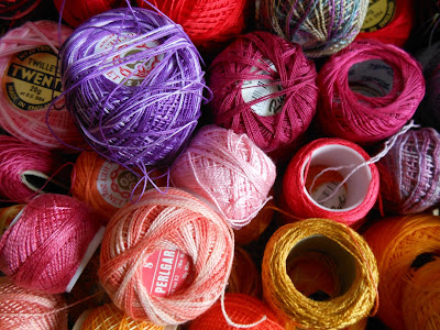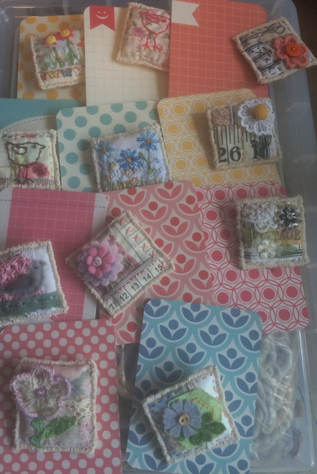 So there is a lovely antique bit of lace,a dyed colour catcher sheet, some lovely yarn I want to crochet something with and some brooches being mounted onto backing cards.